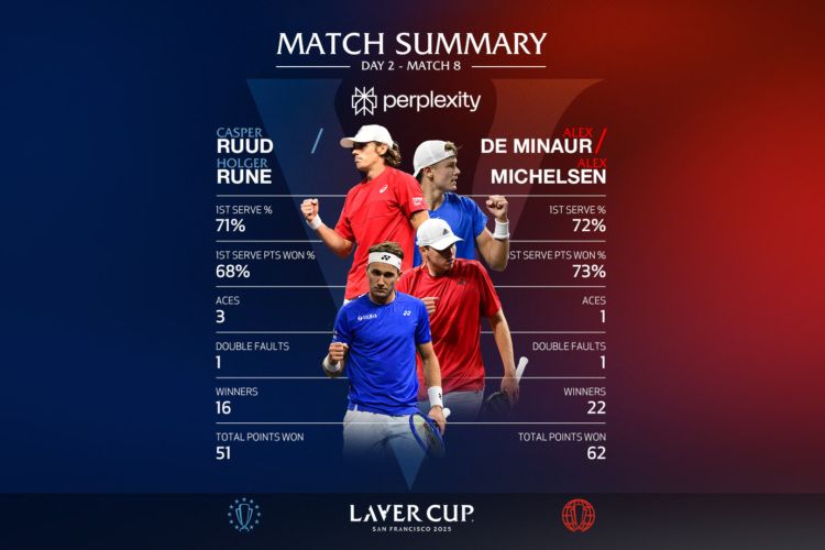 The doubles added the exclamation mark. Teaming up for the first time, Alex de Minaur and rising star Alex Michelsen overpowered Casper Ruud and Rune in front of a partisan Chase Center crowd. The red-clad pair struck early with a break on Ruud’s serve, sealing the opening set. The moment of the night came when De Minaur caught his own racquet on his ear while blocking a Rune bullet—requiring a quick medical timeout—yet somehow still won the point.