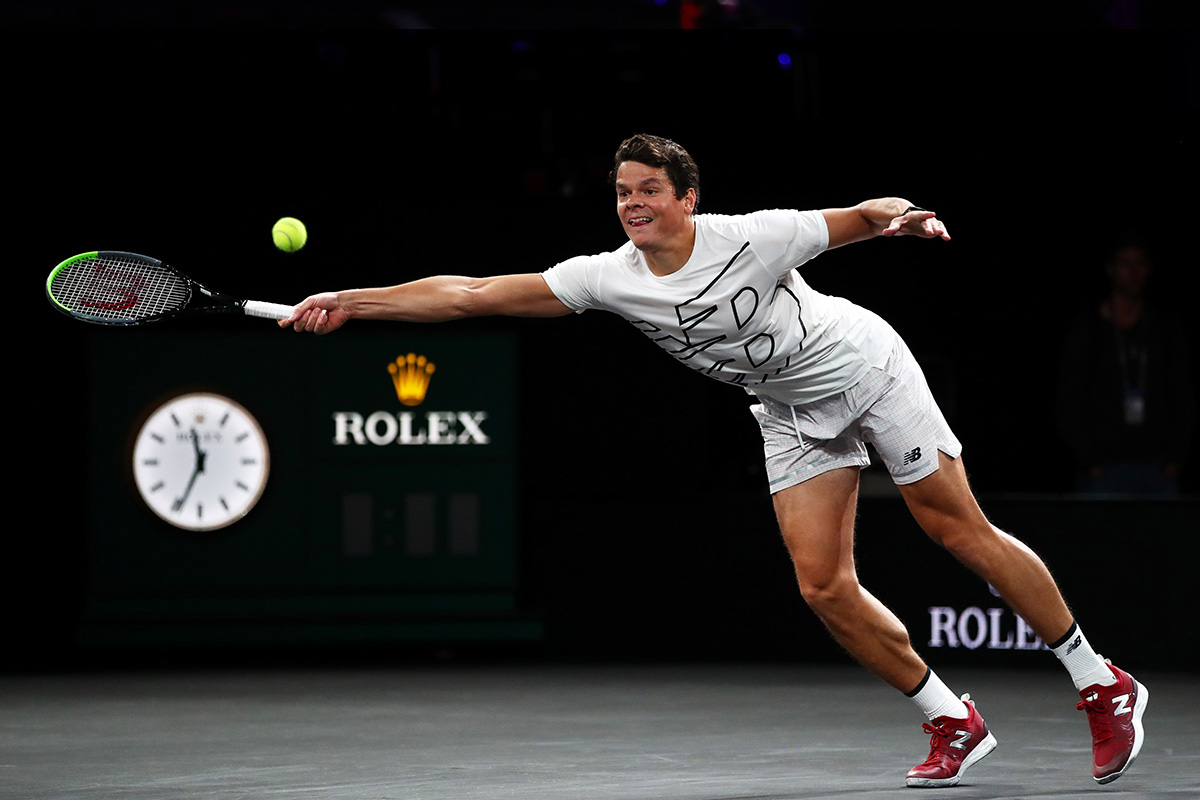 Milos Raonic in full flight during a practice session at the Palexpo on Thursday. Photo by Clive Brunskill/Getty Images for Laver Cup