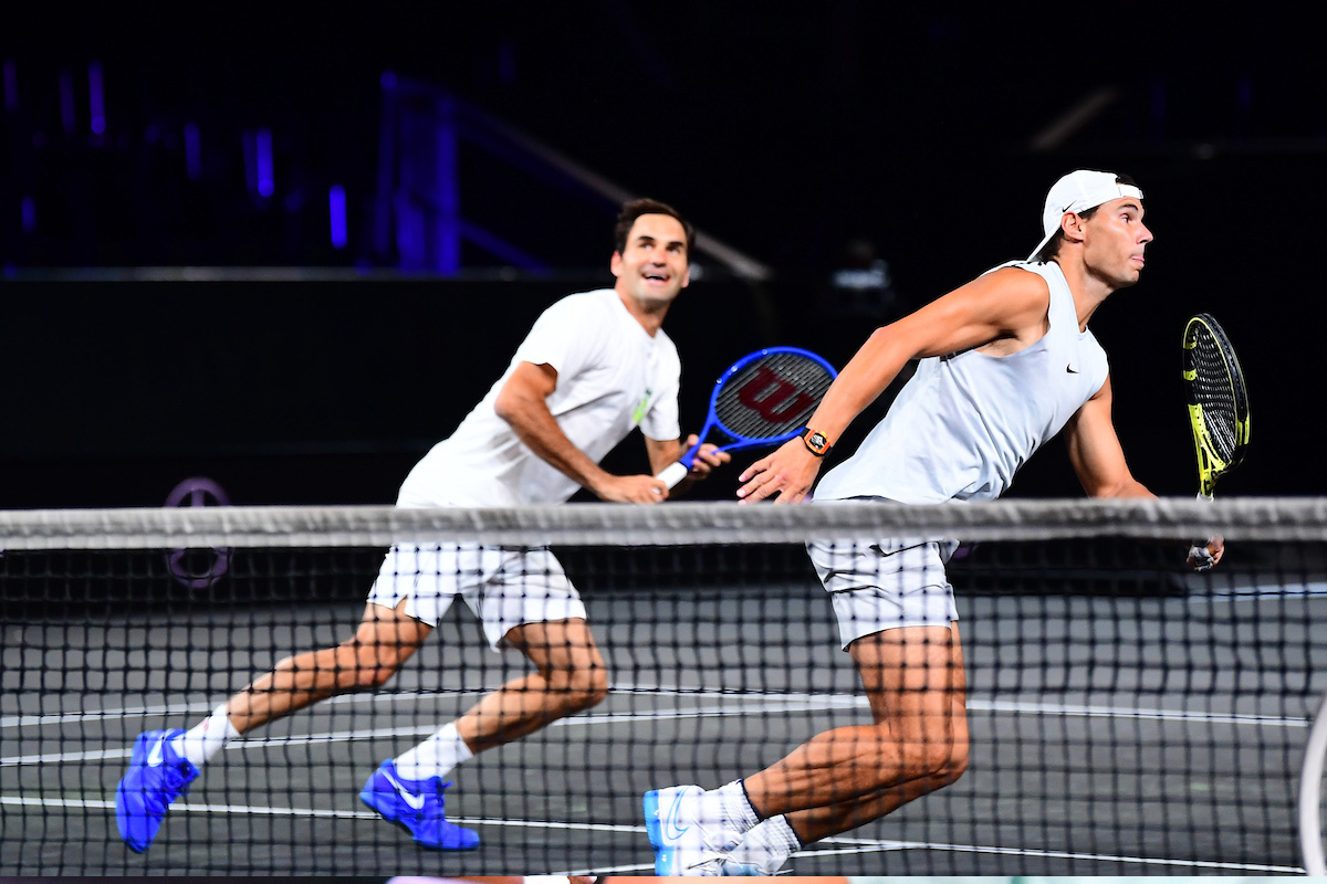 Roger Federer and Rafael Nadal are in step during a Laver Cup 2019 practice session. Photo by Ben Solomon for Laver Cup