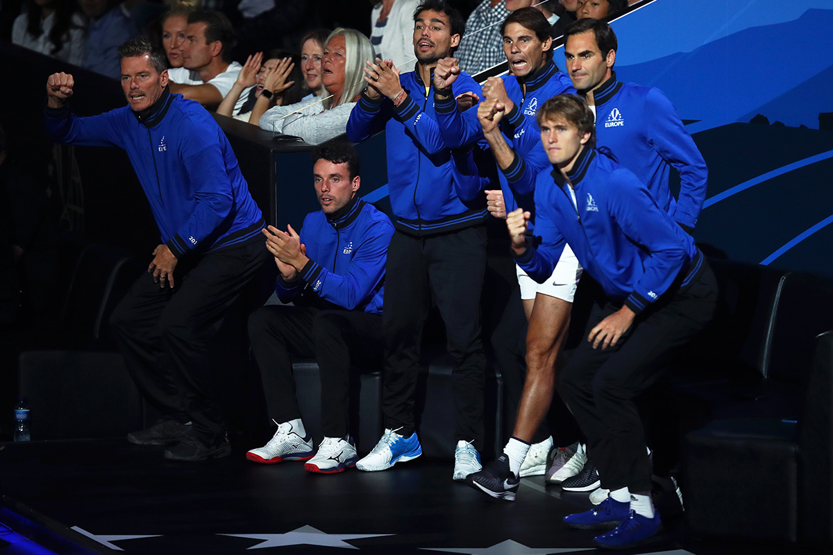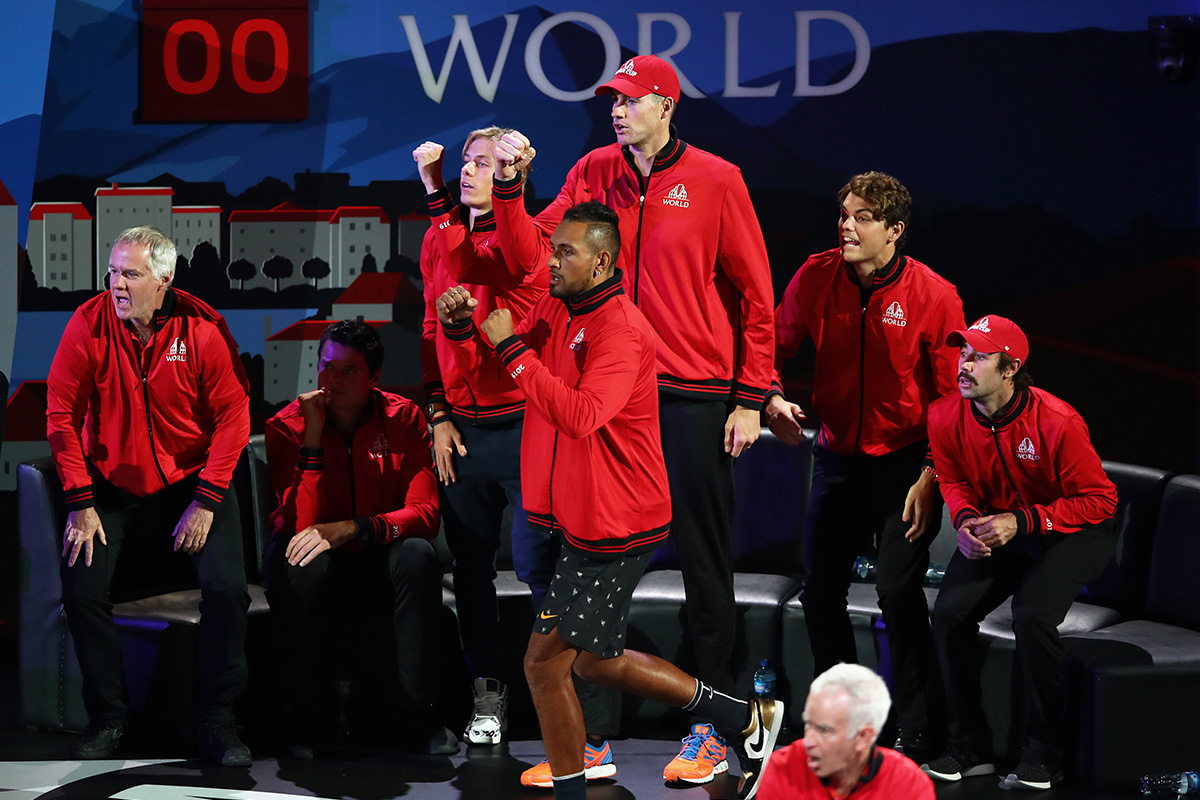 Team Europe celebrate from the courtside in the singles match between Dominic Thiem of Team Europe and Denis Shapovalov of Team World. Photo by Julian Finney/Getty Images for Laver Cup