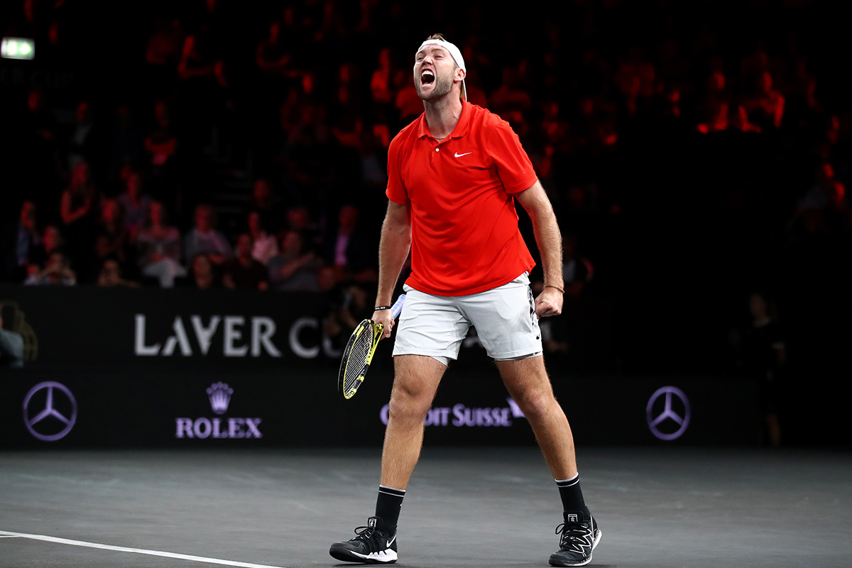 Jack Sock celebrates victory over Fabio Fognini in the second match on Day One. Photo by Julian Finney/Getty Images for Laver Cup