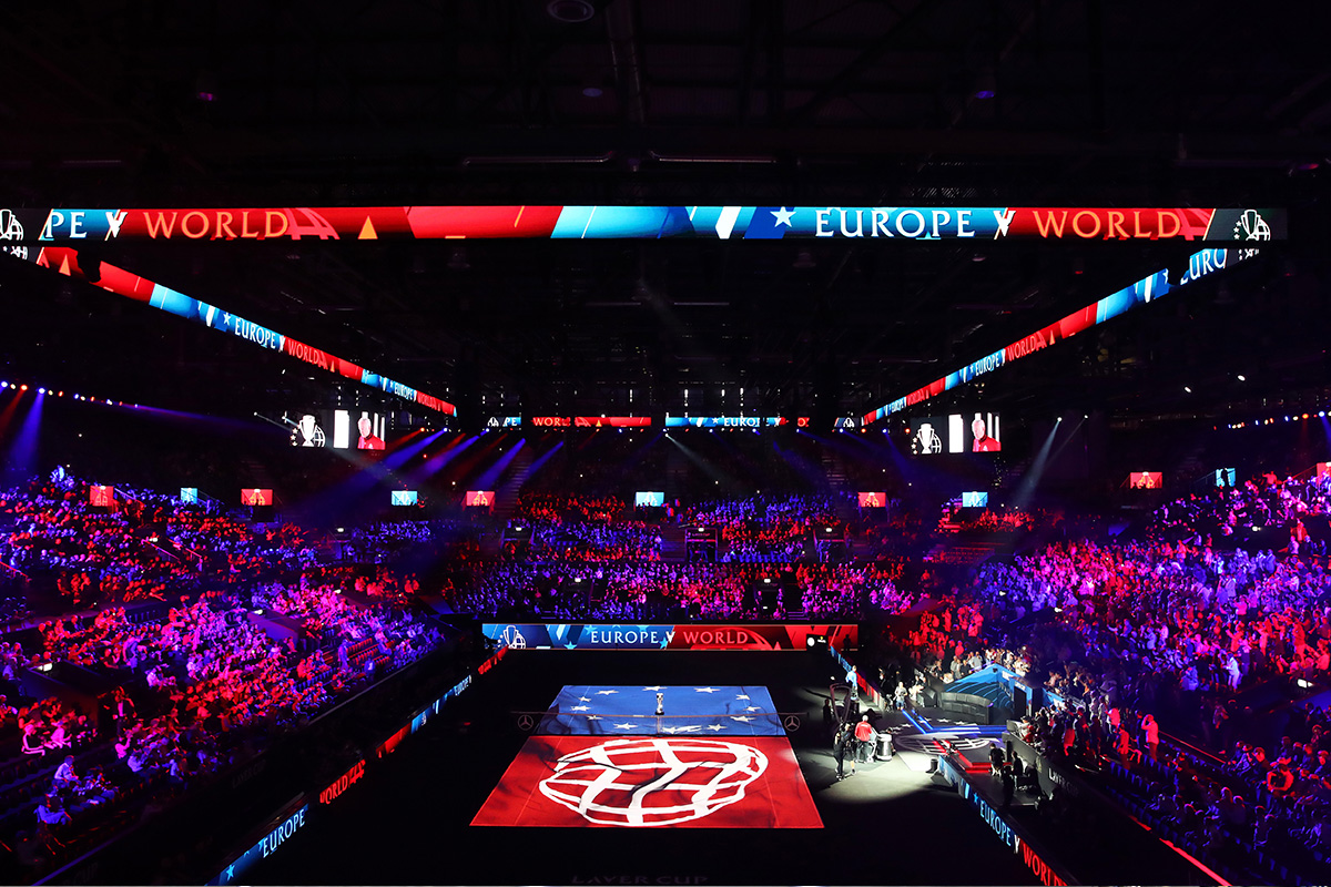 The stage is set at the Palexpo for Laver Cup 2019. Photo by Julian Finney/Getty Images for Laver Cup
