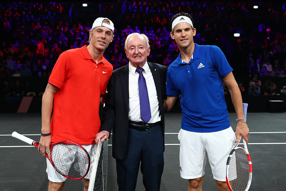 Denis Shapovalov, Rod Laver and Dominic Thiem pose for a photo after the coin toss to start Laver Cup 2019. Photo by Clive Brunskill/Getty Images for Laver Cup