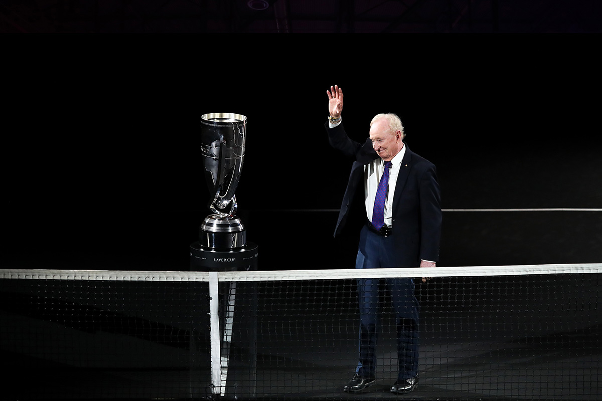 Rod Laver waves to the fans as he is introduced during Day One of the Laver Cup 2019 at Palexpo. Photo by Julian Finney/Getty Images for Laver Cup
