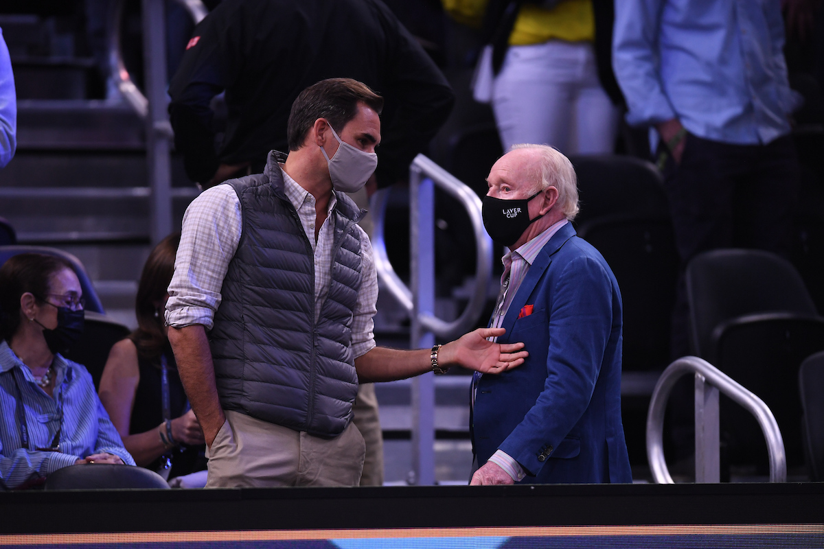 Roger Federer chats to Rod Laver.