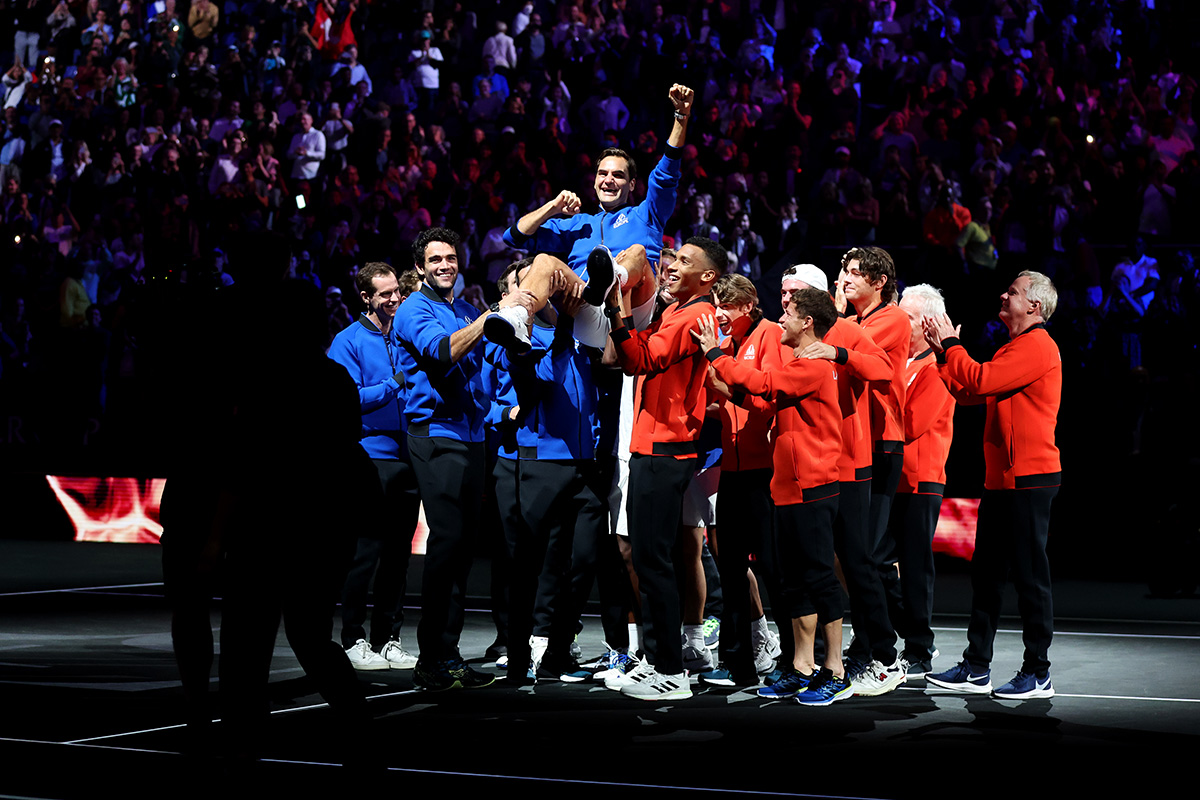 Roger F.ederer is raised up by players from Team Europe and Team World.