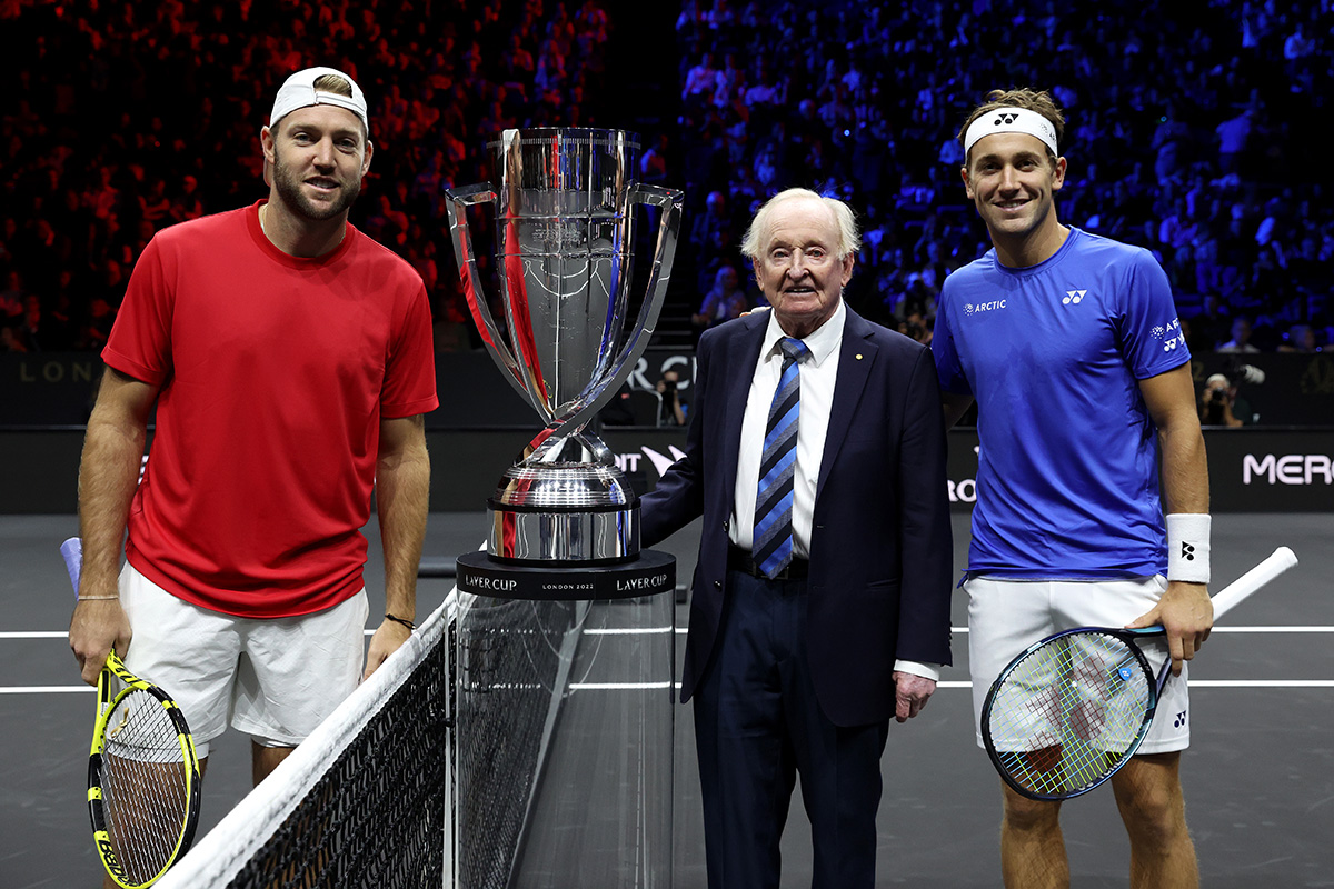 Tennis legend Rod Laver tosses the coin for Match 1 between Jack Sock and Casper Ruud.