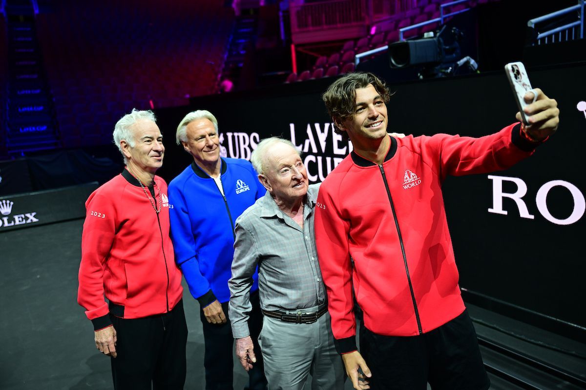 A selfie with tennis legend Rod Laver, Team Europe Captain Bjorn Borg and Team World Captain John McEnroe, courtesy of Taylor Fritz. Photo by Ben Solomon.