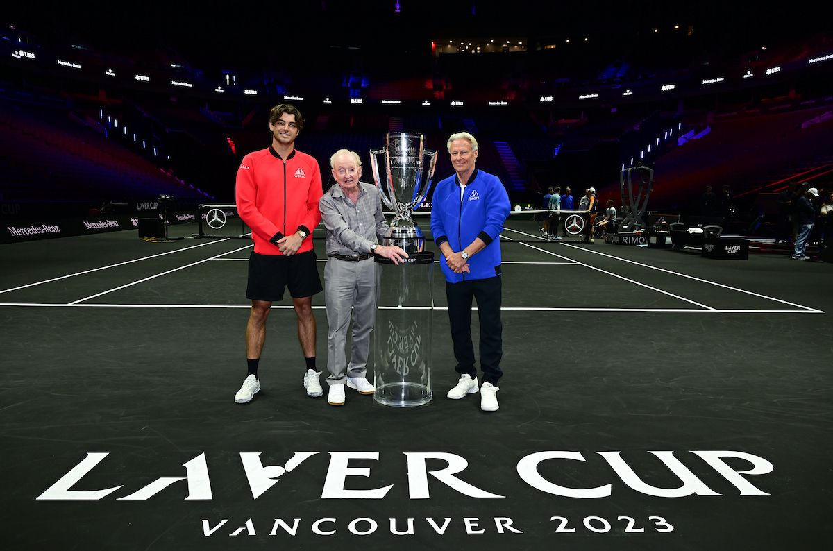 Taylor Fritz, Rod Laver and Bjorn Borg pose with the Laver Cup trophy. Photo by Ben Solomon.