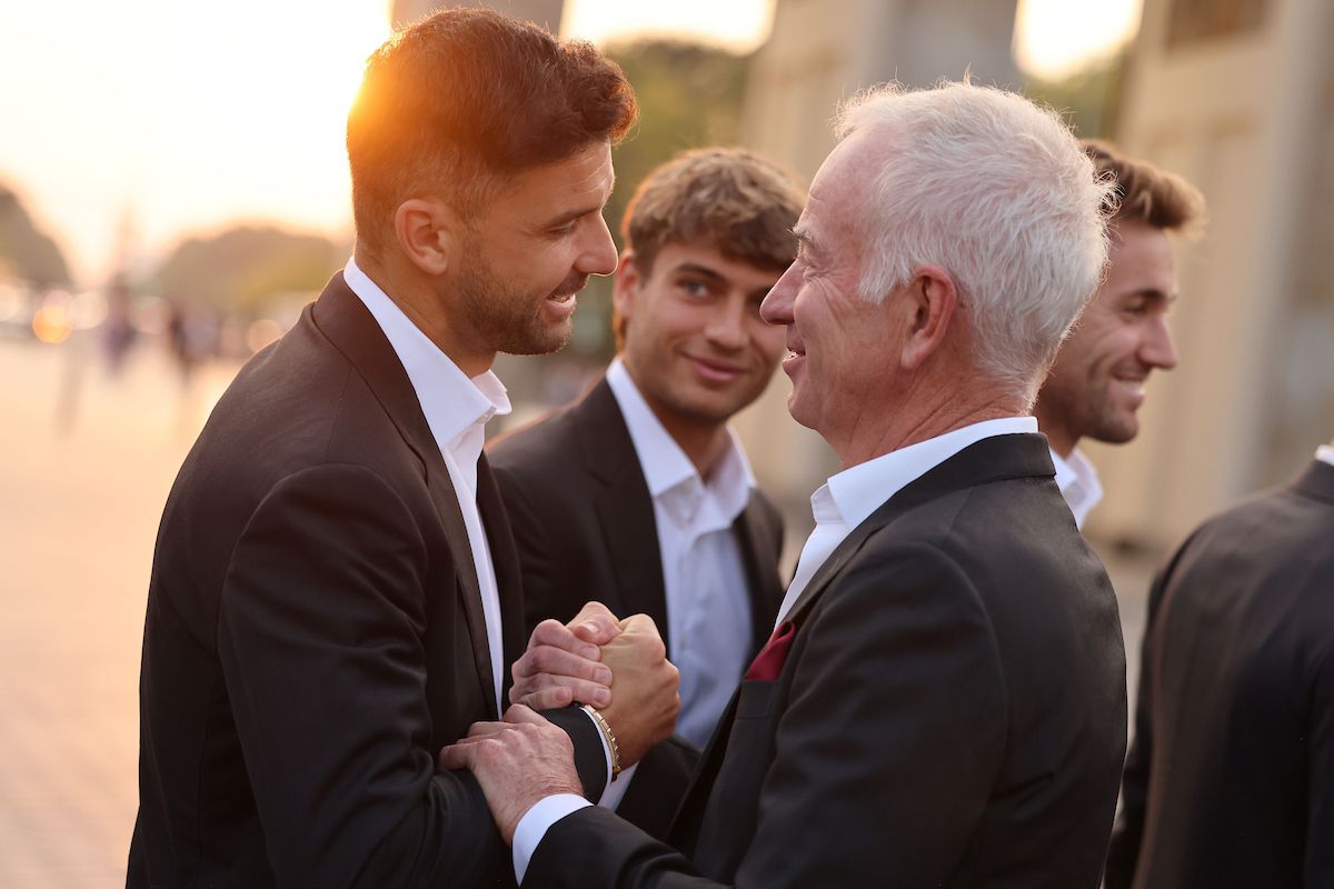 Grigor Dimitrov greets Team World Captain John McEnroe. Photo by Gerald Matzka/Getty Images