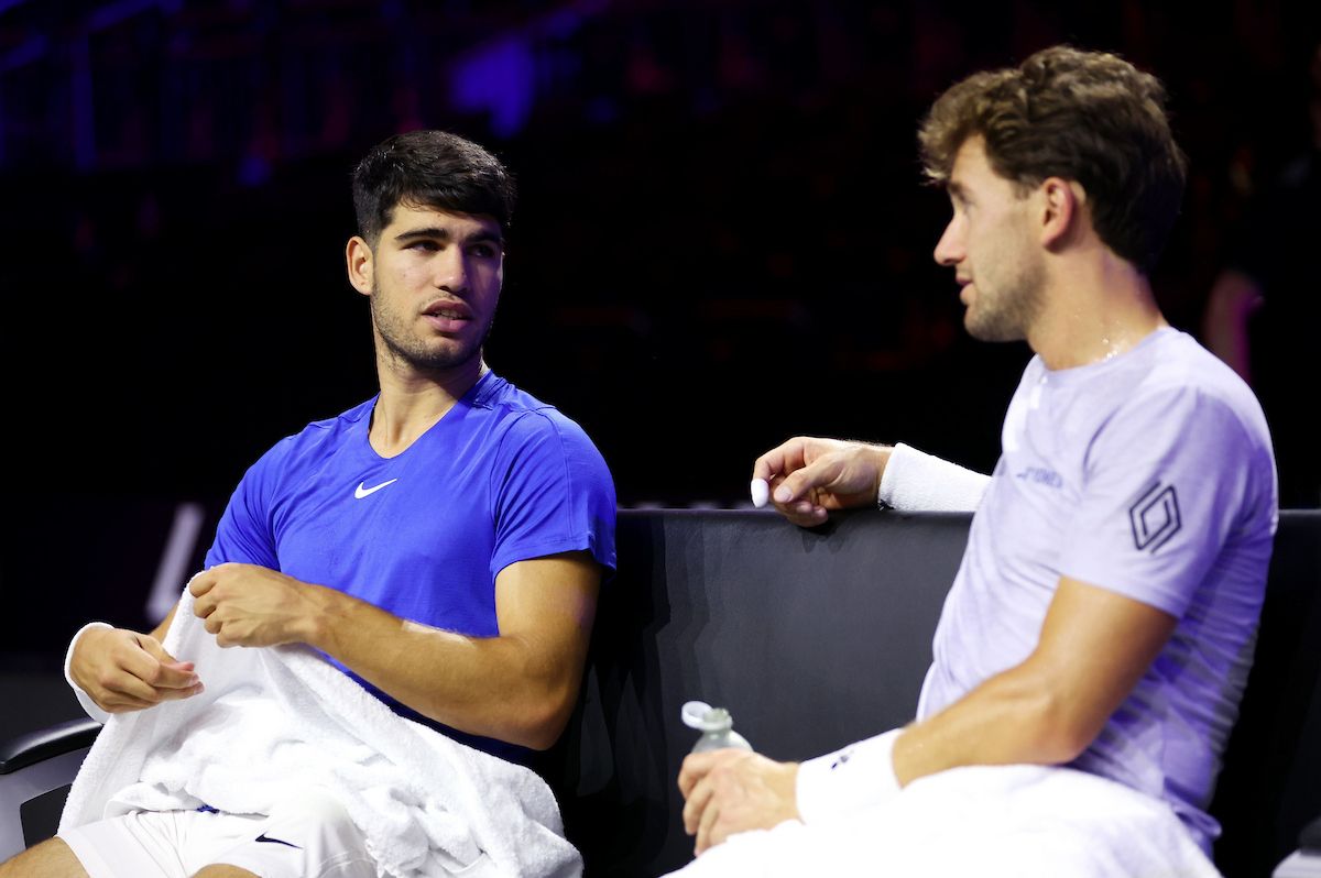 Carlos Alcaraz at his first practice session with Team Europe. Photo by Clive Brunskill/Getty Images
