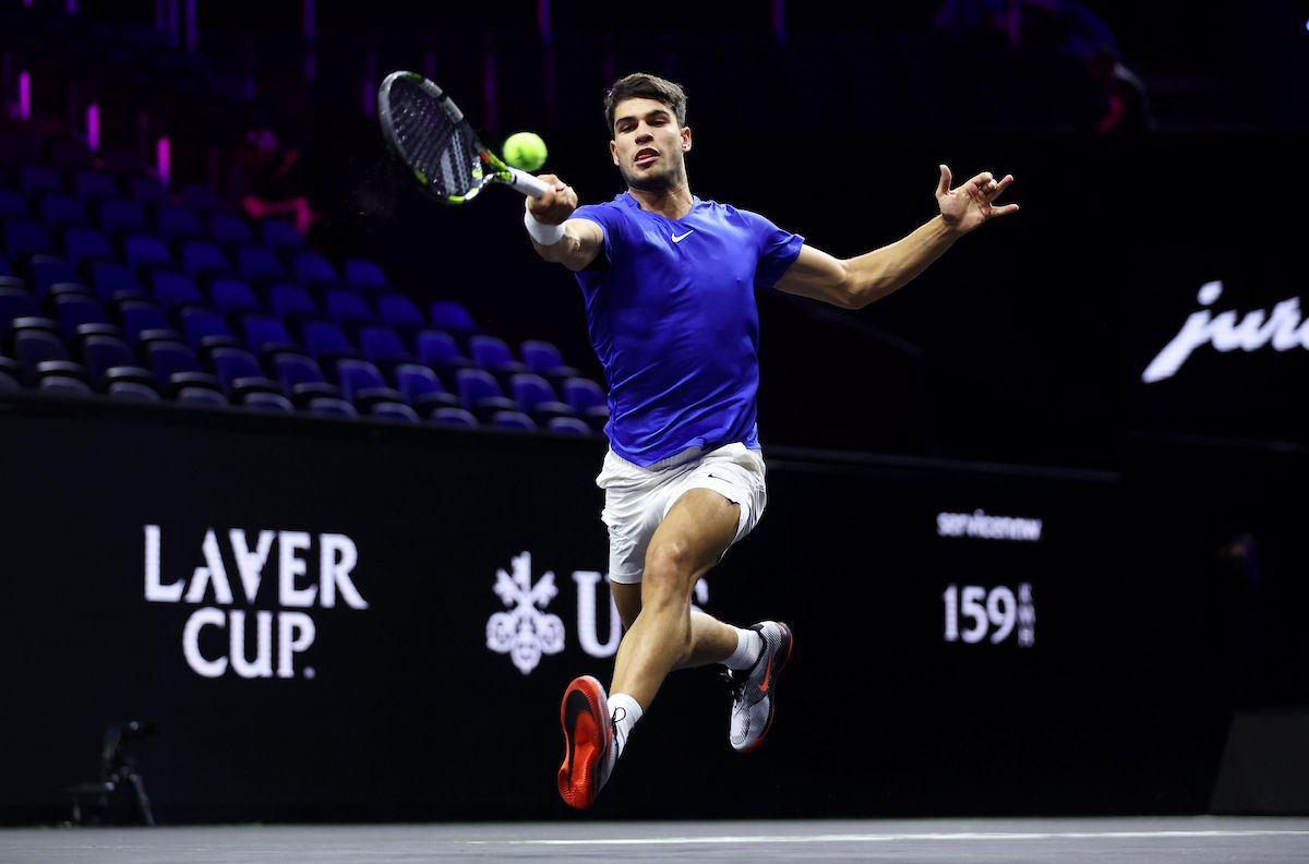 Carlos Alcaraz at his first practice session with Team Europe at Uber Arena. Photo by Clive Brunskill/Getty Images