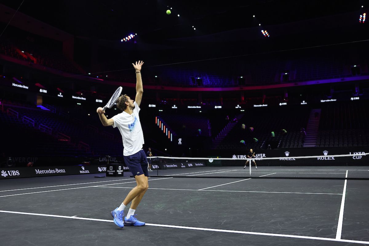 Daniil Medvedev serves during Team Europe practice. Photo by Maja Hitij/Getty Images for Laver Cup