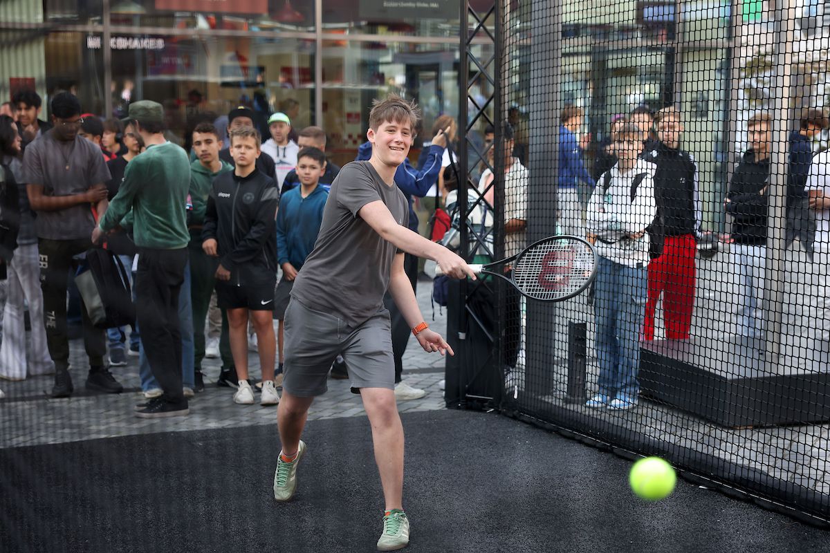 Testing out tennis skills at the Laver Cup Fan ZOne. Photo by Gerald Matzka/Getty Images for Laver Cup