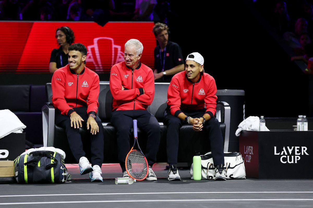 Team World trio Francisco Cerundolo, John McEnroe and Alejandro Tabilo during Open Practice Day. Photo by Maja Hitij/Getty Images