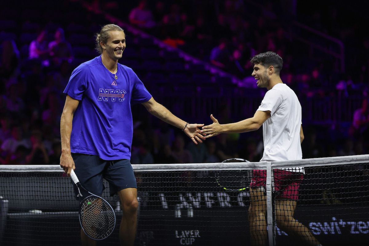 Alexander Zverev and Carlos Alcaraz shake hands at Team Europe’s Open Practice session. Photo by Maja Hitij/Getty Images