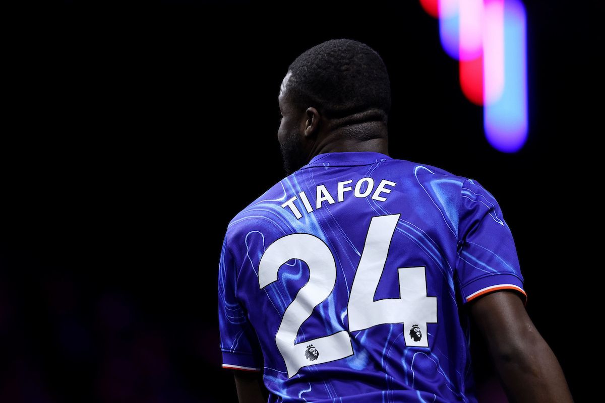 Frances Tiafoe practices in a Chelsea FC shirt. Photo by Maja Hitij/Getty Images