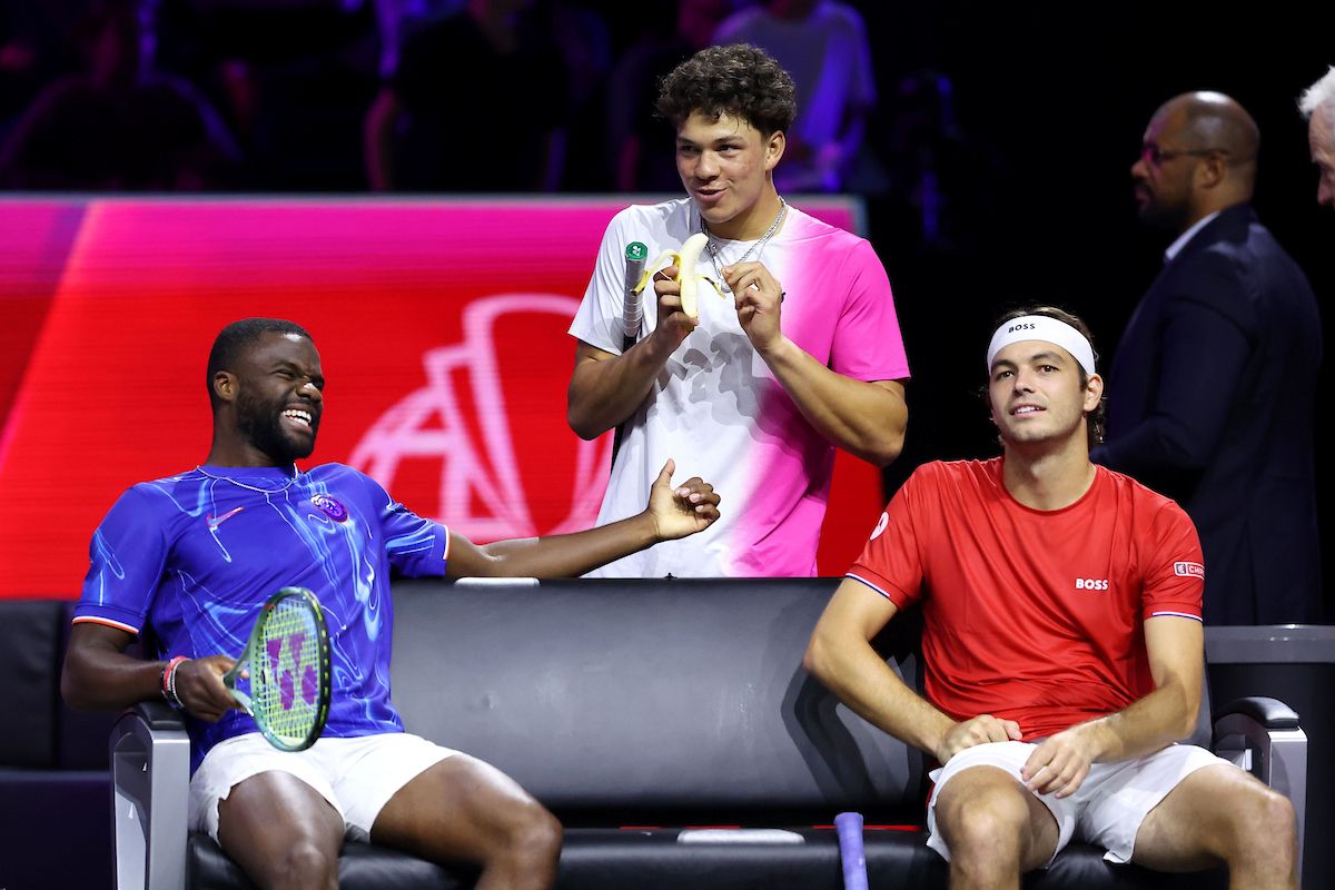 Americans Frances Tiafoe, Ben Shelton and Taylor Fritz take time out during Team World’s Open Practice. Photo by Maja Hitij/Getty Images