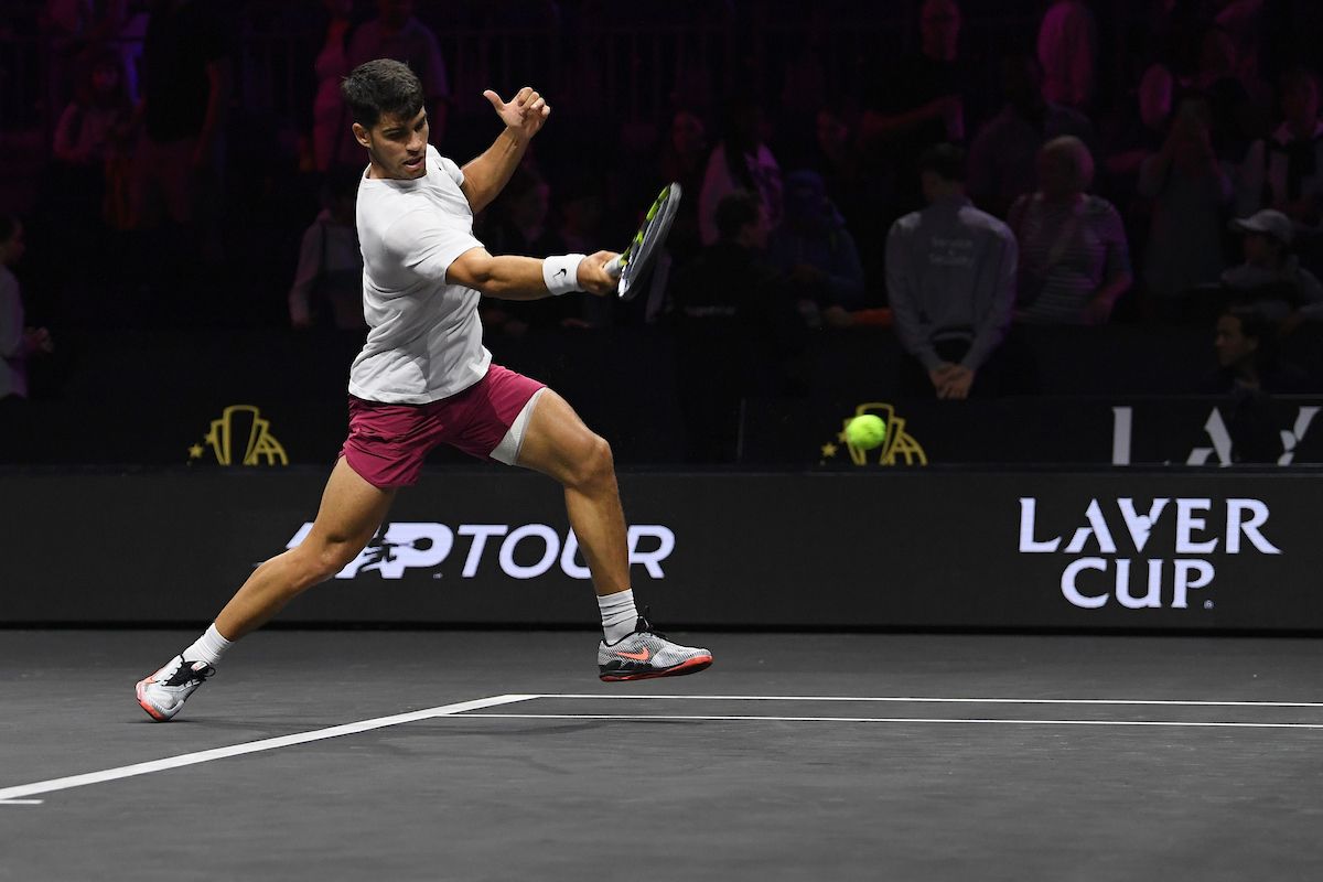 Carlos Alcaraz of Team Europe plays a forehand at Open Practice Day. Photo by Luciano Lima/Getty Images