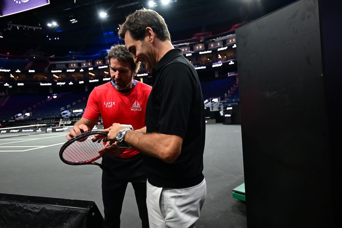 Pat Rafter and Roger Federer check out the equipment. Photo: Ben Solomon/Laver Cup