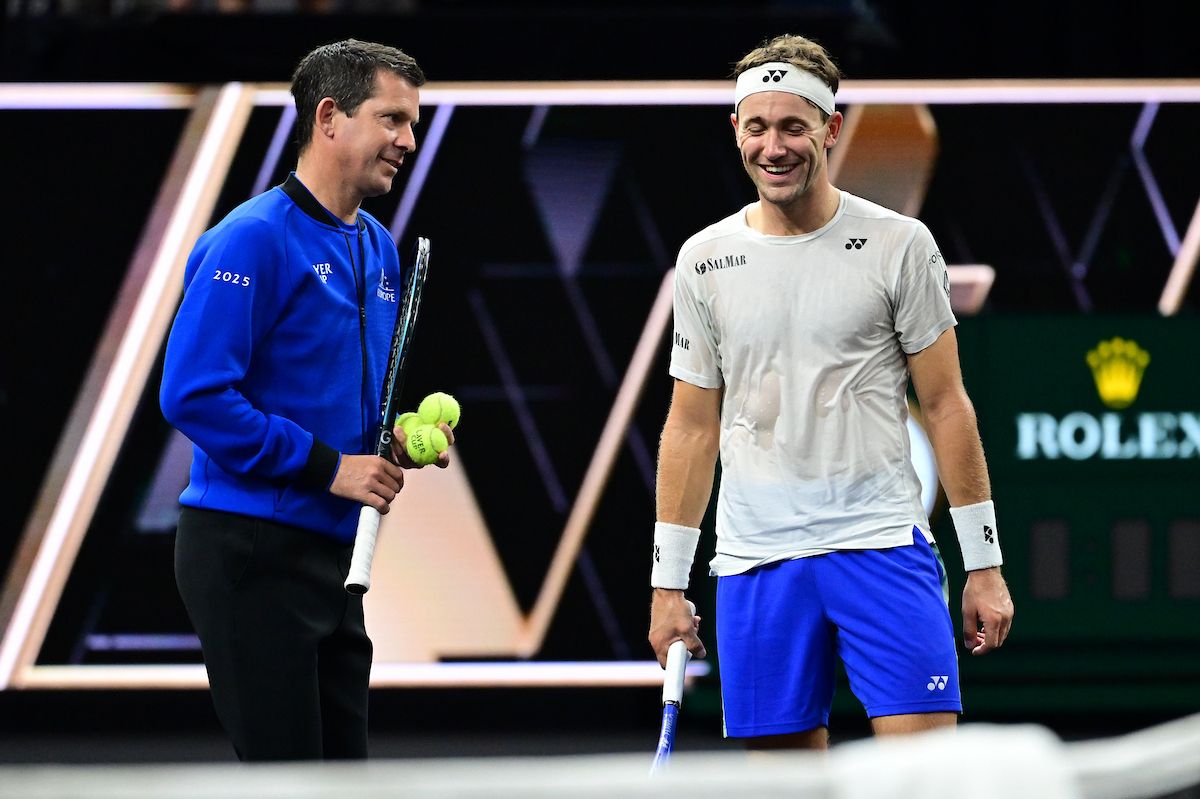 Casper Ruud shares a joke with Tim Henman during a Team Europe practice. Photo: Ben Solomon/Laver Cup