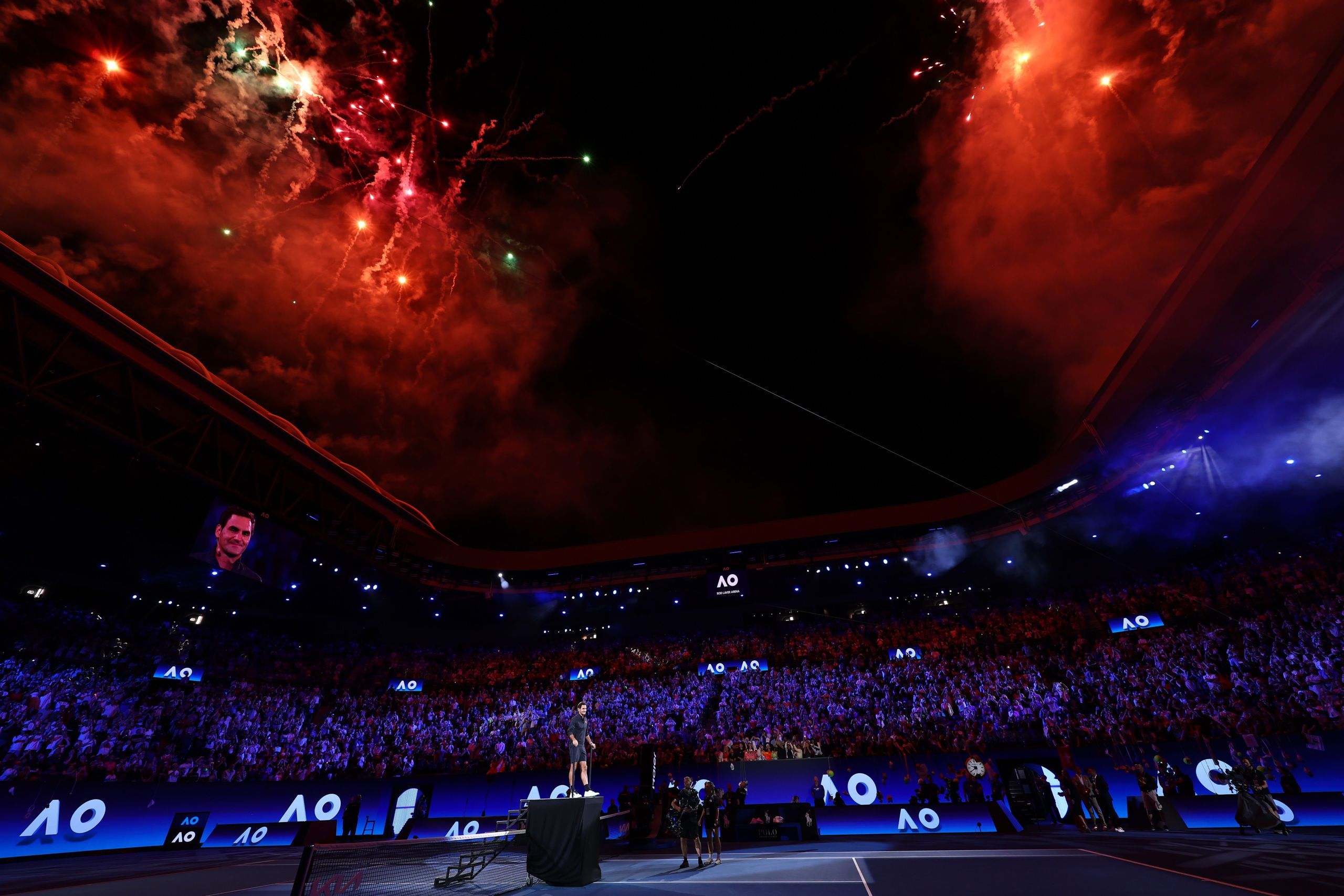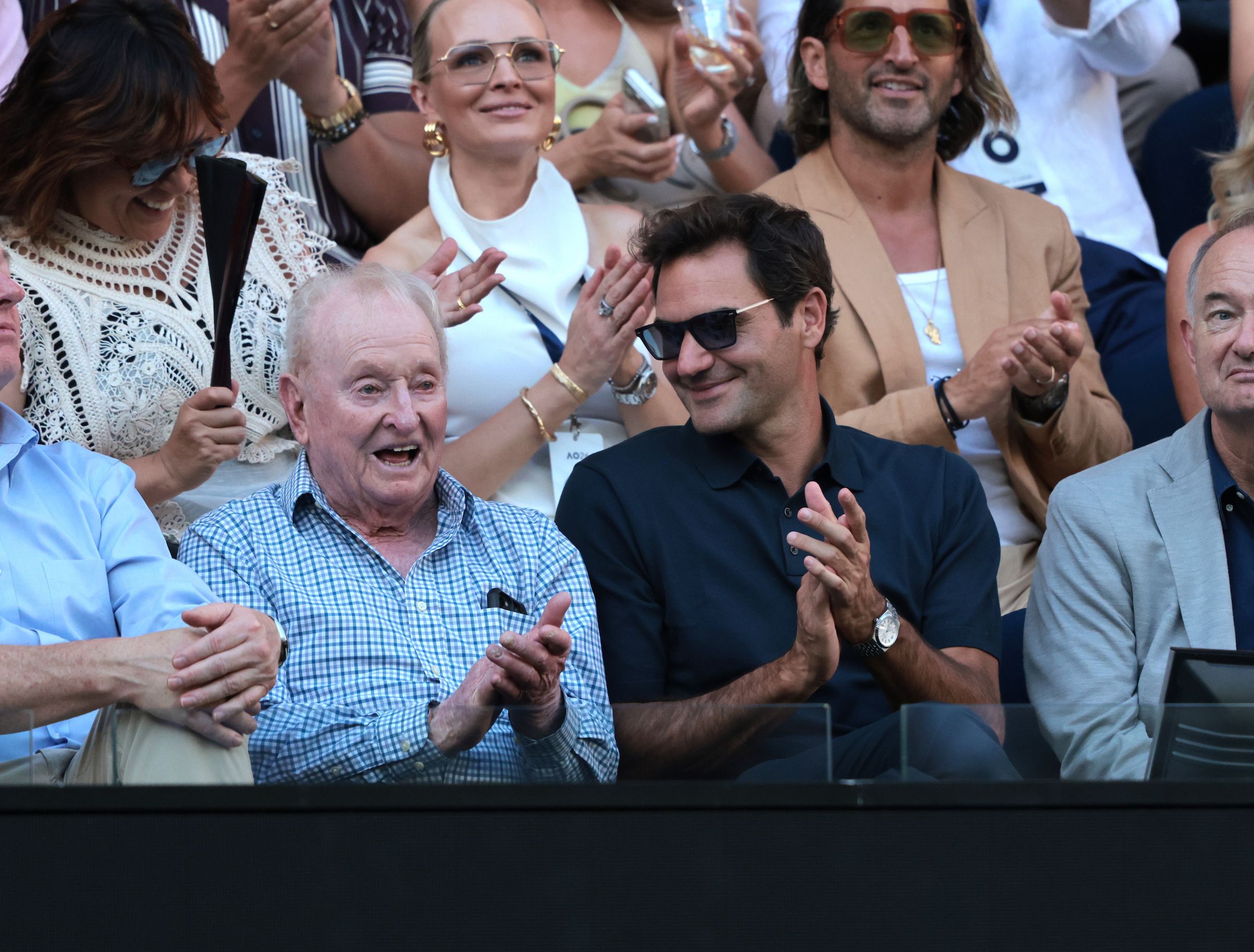 Roger Federer joins Rod Laver to watch the action on center court.