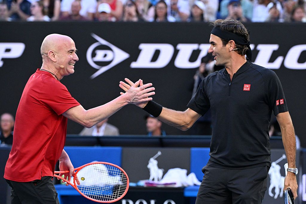 Roger Federer partners with Andre Agassi at the AO Opening Ceremony.